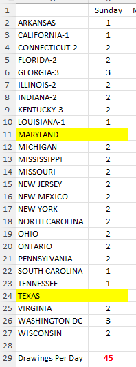 I will have to double check this, but there are 45 drawings on SUNDAY (no drawings in Texas and you cannot play Maryland online).