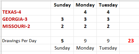 There are exactly 23 drawings in these 3 states on Sunday, Monday, and Tuesday. This means that ONE hit in these 3 days will make this strategy profitable.