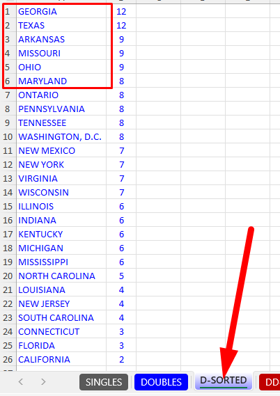 Always check the last HIT REPORT that I post on SUNDAY morning to see which of the hottest blue states (where doubles hit the most) did NOT get a hit the previous week (these are the blue states on the D-Sorted sheet). Focus primarily on GEORGIA and TEXAS for now. There is a good chance that a double will hit that state the following week.