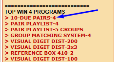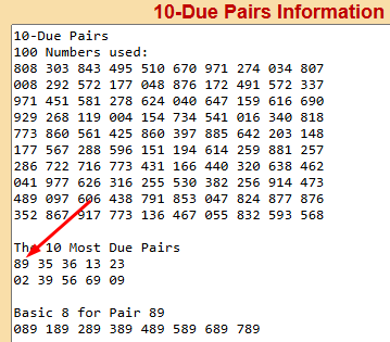 The most basic (and maybe the best) Pick 3 strategy is to find the most due pair in your state. This reduces your playlist down to just 10 numbers (the most due pair + digits 0 to 9 = 10 numbers). You can automatically reduce the list to 8 numbers by removing the two doubles because singles hit 72% of the time. You can experiment with the 3rd digit. You can use a HOT digit (because the two digits making up the most due pair tend to be COLD digits). Use the 10-DUE PAIRS program to find the most due pairs in the Pick 3 game right now (enter the last 100 numbers that hit your state). This is the top program on the menu (see below). The program will give you the 10 most due pairs. The most due pair is the one on the top left. In the example below, pair 89 is the most due pair (followed by 35, 36, etc.). STRATEGY: You can also connect the most due pair (89) with any of the pairs that have an 8 or a 9. This means that pair 89 can be connected with due pairs 39, 69, and 09, making up numbers 389, 869, and 089. Once the most due pair hits, redo the workout (enter the last 100 numbers that hit).