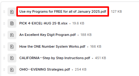 You can use all my Pick 3 and Pick 4 programs for FREE from now until January 31. To get access, go HERE and open the PDF in red below to get the login details.