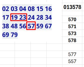 The 3 most due pairs in New York are 19, 23, 57, and I also know that this set of digits is due: 013578. Since 57 is in the set, there is a good chance that one of these numbers will hit when pair 57 hits: 570, 571, 573, 578, 577, 557.