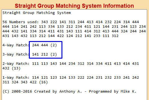 I coded the last 56 numbers that hit New York. These are the hottest straight codes: 244 and 444, also 141 and 212.