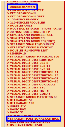 EXAMPLE: The 3 hottest codes in NEW YORK in the last 100 drawings are 134, 144, and 114. Codes 134 and 144 have hit recently (JANUARY 27 = 990 (Code 144) and JAN 23 = 058 (Code 134). But code 114 has not hit since Thursday JANUARY 23. Code 114 hit in the number 911 (five days ago). So it’s due. So that is what I am predicting will hit soon. Use the Straight Positional Control program to get the playlist for a code. Then use the Consolidation program to remove duplicates; you will get duplicate numbers in codes with repeating digits: 114, 144, 244, 444, etc.