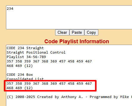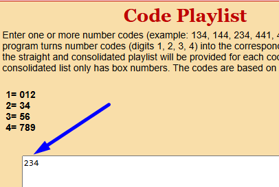 To turn the codes into the actual numbers to play, enter the code into the Code Playlist program. To avoid confusion, do ONE code at a time.