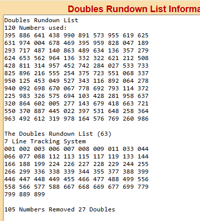 3-Enter the last 120 numbers that hit into the DOUBLES RUNDOWN Program. Below I am using GEORGIA numbers in my example. This program removes the most recent 30 doubles that hit from the standard list of 90 doubles. The remaining 60 to 65 doubles make up the Doubles Rundown List. The doubles that hit soon after are usually on this list.