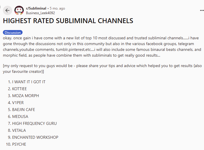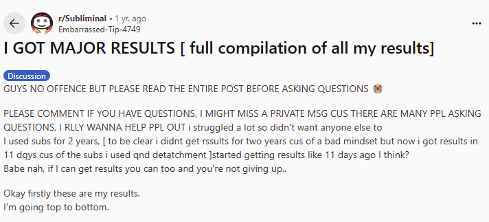 Just so you know; it seems like subliminals (at least the ones posted on YouTube) are used (mostly) by young people to create physical changes like thicker lips, lighter skin, thinner waist, thinner nose, etc. For example, on THIS POST, this person lists all the (physical) benefits they got from listening to subliminals.