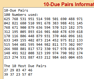 Please do this for your state! Just enter the last 100 numbers that hit your state into the 10-DUE PAIRS program to find the most due pairs. You will need that and the last number that hit your state.