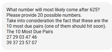 625 was the last number to hit New York. The 20 numbers predicted by ChatGPT are on the bottom of this page. This should be interesting!