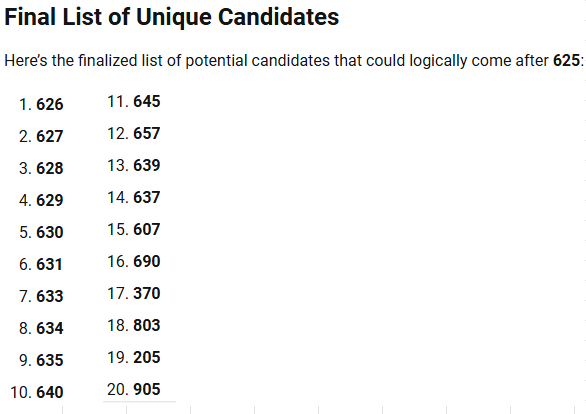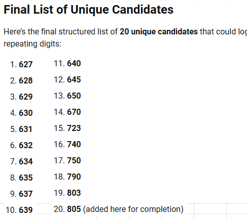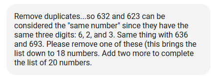 Remove duplicates from the list. For example: 725 and 752 are considered the “same number” since they both have digits 2, 5, and 7. Same with 347 and 743. Also 128 and 218. All 20 numbers should be unique non-repeating numbers. Also, no repeating digits or doubles (example: 117, 224, 767, 229, etc.). All 20 numbers should have three different digits.