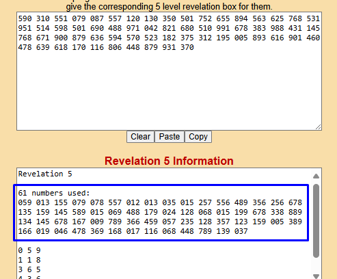 Working with box numbers dramatically simplifies the game. Now, instead of a 1 in 1000 chance of hitting, you have (approximately) a 1 in 210 chance of hitting (120 singles + 90 doubles). For example…if you are feeding the AI the list below (590 to 370) ….you can ask it to “convert all numbers into a low to high format: turn 590 into 059, turn 310 into 013, and so forth.” – OR you can just copy the list…590 310 551 079 087 557 120 130 350 501 752 655 894 563 625 768 531 951 514 598 501 690 488 971 042 821 680 510 991 678 383 988 431 145 768 671 900 879 636 594 570 523 182 375 312 195 005 893 616 901 460 478 639 618 170 116 806 448 879 931 370—and paste it into one of the REVELATION programs and the program will automatically convert the numbers into box numbers (low to high digit).