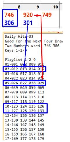 Check to see what lines have hit your state recently. For example, the 920 and 301 that hit New York yesterday came from key 1-2-9 from 746/306. Number 920 (029) is in line 5 (one of the hot lines in NY) and 301 (013) came from line 2 (another hot line in NY).