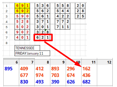 TENNESSEE-Here are the numbers for Friday July 11. I suggest playing 691 and 692 straight–the rest of the red numbers can be played box. There are three pairs: 20, 28, 25–which means that a 2 is very likely to hit on Friday.