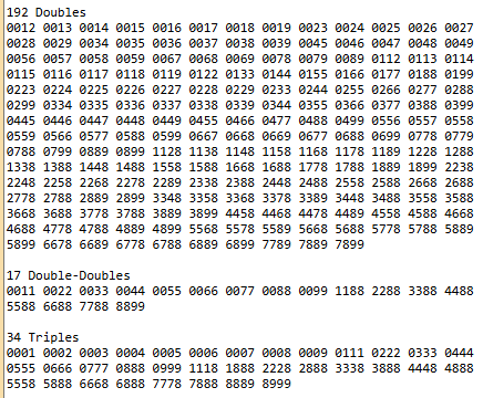 012 013 014 016 018 019 024 025 027 028 029 036 037 045 048 049 056 058 078 123 127 128 129 134 136 137 139 147 148 149 158 159 167 168 178 179 235 236 237 239 245 246 247 249 256 257 258 259 267 268 269 279 289 345 347 349 356 359 369 457 459 469 478 489 568 569 578 579 678 679 (70)