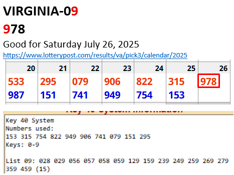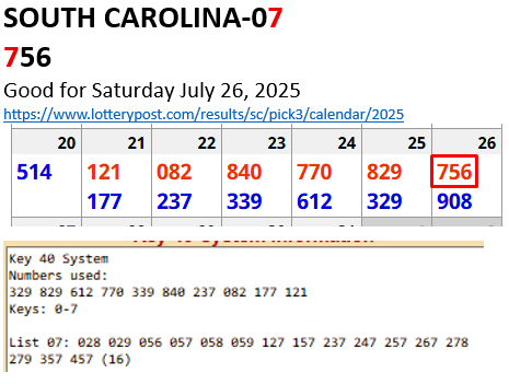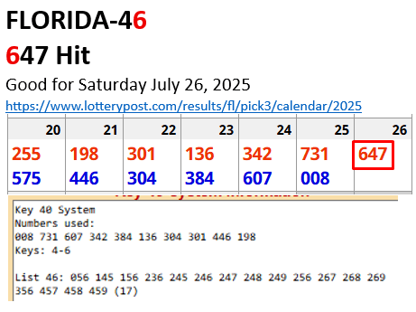 Here is how: Notice below that the key that hit is in the FIRST position (Example: Florida, Key 6 hit in 647). Also, the second and third digits are low-high (Florida: 4 is low, 7 is high). So we have the structure of a STRAIGHT hit here: KEY-LOW-HIGH.