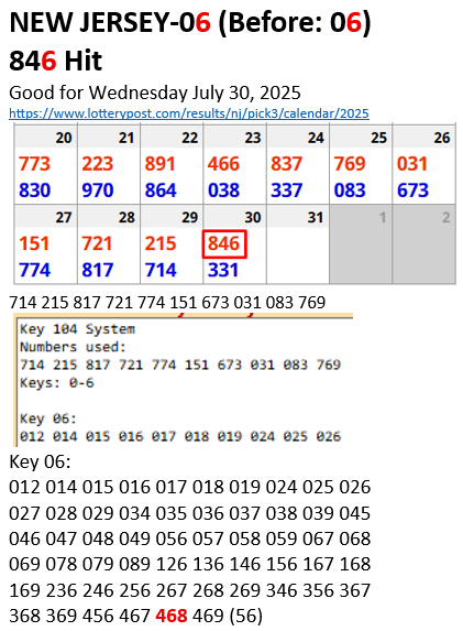 Here you will see the 4 states from the Wednesday July 30 report that had repeating keys from the day before. For example, the keys for New Jersey are 06 – which are the same keys for NJ from the day before. The 6 hit New Jersey today in 846. The same thing happened today in Illinois, Minnesota and Mississippi.