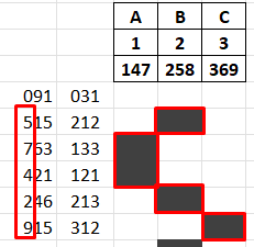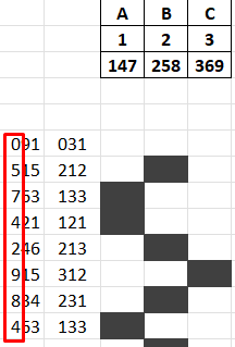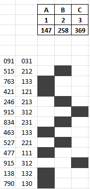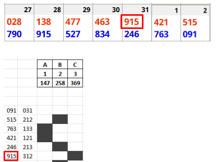 Write the numbers that hit on the RIGHT and the code on the LEFT. For example…look at 915. Based on the coding system the first digit (9) is C (369). I like to use digits so the first part of the CODE for 915 is 3xx. Next is 1, which is part of A (147)….so the code now is CA (or 31x). The last digit in 915 is 5 which is part of B (258). Therefore, the code for 915 is CAB or 312.