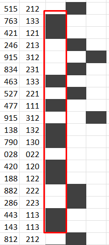 You can see more clearly what I am doing below. Look at 515. The first digit (5xx) is part of B (258) – that is why the second position is grayed out. Same for 753 (first position is 7xx): the FIRST box is greyed out because 7 is part of A (147). Same with 421; 4 is part of A. in 246, the second box is grayed out because 2 is part of B (258). In 915, the third box is gray because 9 is part of C (369).