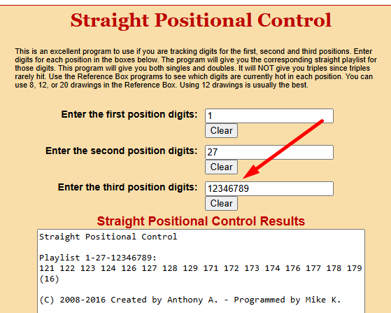We use this information to determine which digits to REMOVE from the 3rd position on the Straight Positional Control Program. For example, if I am NOT expecting formula 125 to hit next time (3rd position is 5 or 5 and 0), I will remove 5 and 0 from the 3rd position.