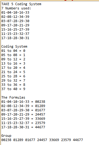 Here is the coding system I am using. Every TAKE 5 number is reduced to a 5 digit number.