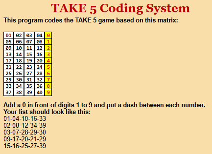 Here is the coding system I am using. Every TAKE 5 number is reduced to a 5 digit number.