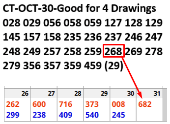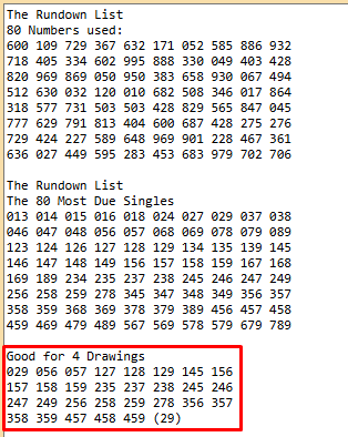 The list I added about has about 30 numbers – but I am expecting a hit in 4 drawings. You can get the list yourself from the RUNDOWN program…..