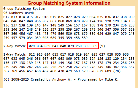 Copy the 16 numbers above and the 80 Rundown numbers into the Group Matching program. When I do that, I get these 9 numbers: