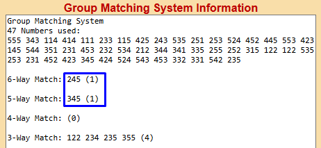 For the 555 coding system program, you want to find the TWO hottest box codes: Copy the straight codes into the Group Matching program to turn straight codes into box codes. Use the last 30 to 50 drawings. You can use more drawings for confirmation (sometimes the hottest code in the last 100 drawings is the same as the hottest code in the last 30 or 40 drawings).