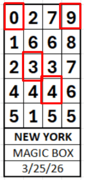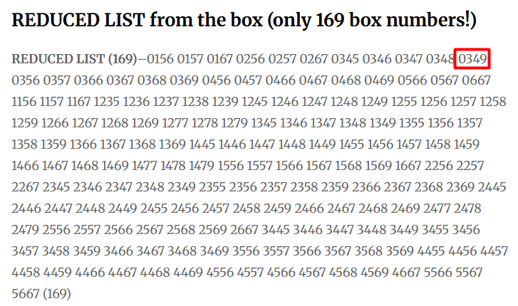 REMEMBER: Most of the hits from the Magic Box (both Pick 3 and Pick 4) come from the top two digits in the first position (0xxx and 1xxx in the box below). This reduces the list (2x5x5x5). 0349 just hit New York. Its on the reduced list (just 169 box numbers.