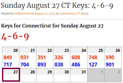 Sunday August 27, 2023: I lost some money playing Connecticut tonight because I was SURE that a 4 would hit based on what I have been seeing lately. Below is the prediction I posted last night: