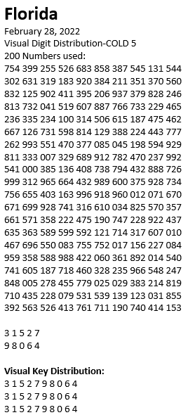 I am testing out a new system. This system only requires the last 200 numbers that hit (not the last 1400 numbers). The system works like this: you enter the last 200 numbers into the Visual Digit Distribution program to get the 7 hottest digits. Wheel these to get 35 singles. Then remove numbers from the list (starting from the last number that hit) until there are 5 numbers left. You can find the NY numbers HERE. See below.