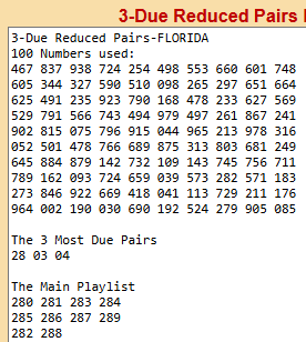 You may not want to play all 10 numbers for a due pair (especially if you are playing more than one state). That is why the program gives you different levels of reduction: 4, 6, and 8. The first level of reduction is 4 numbers. This means that if you want to play the LEAST amount of numbers possible, these are the four numbers I recommend. You will NOT get a hit every time, but you will get a hit many times….by just playing 4 numbers.